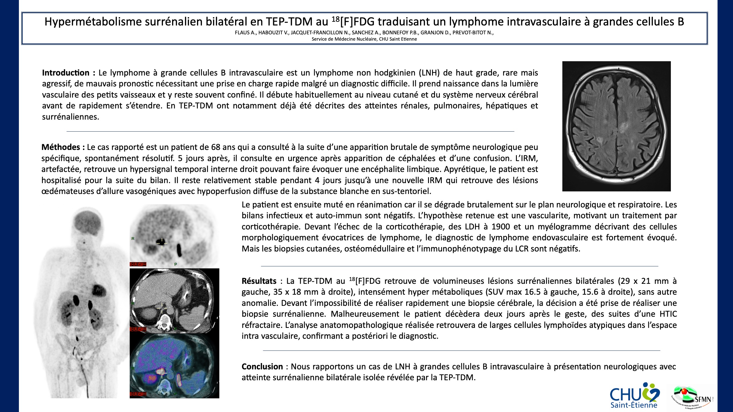 Resultats: La TEP-TDM au 18[F]FDG retrouve de volumineuses lésions surrénaliennes bilatérales (29 x 21 mm a gauche, 35 x 18 mm a droite), intensément hyper métaboliques (SUV max 16.5 a gauche, 15.6 a droite), sans autre anomalie. Devant l’impossibilité de réaliser rapidement une biopsie cérébrale, la décision a été prise de réaliser une biopsie surrénalienne. Malheureusement le patient décedera deux jours apres le geste, des suites d’une HTIC réfractaire. L’analyse anatomopathologique réalisée retrouvera de larges cellules lymphoides atypiques dans l’espace intra vasculaire, confirmant a postériori le diagnostic.