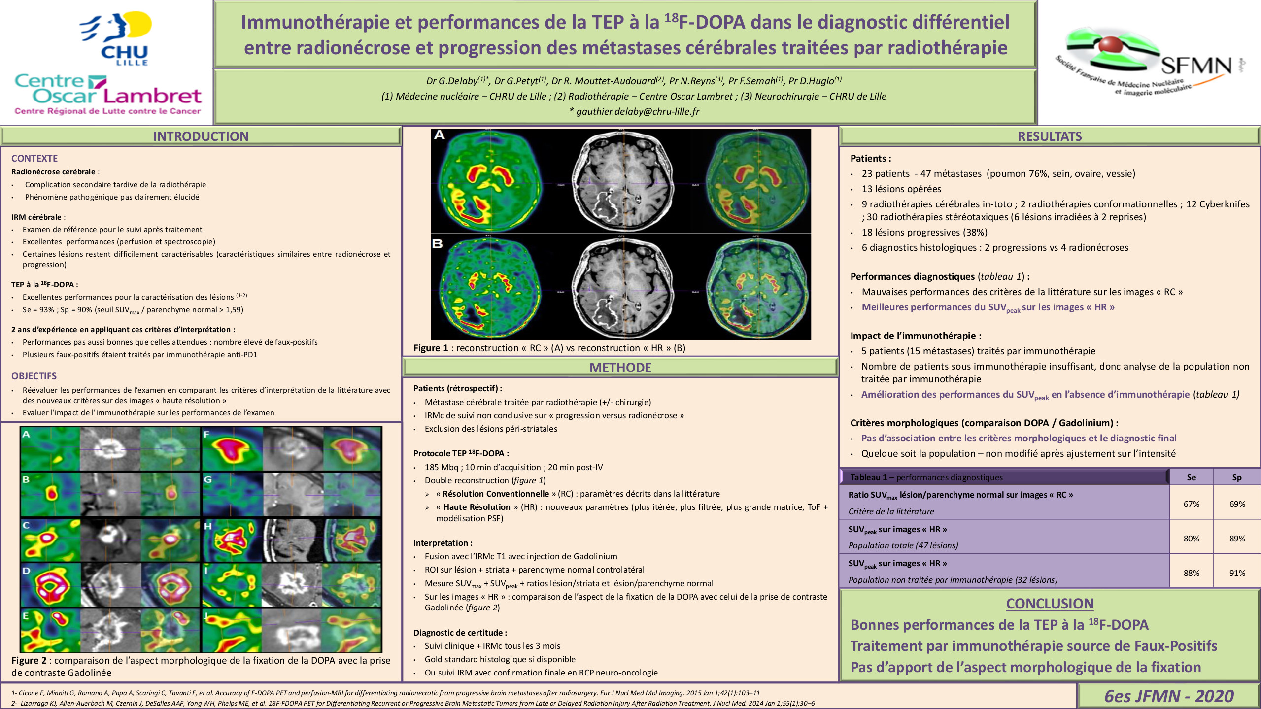 Conclusion: La TEP a la [18F]-Fluoro-DOPA est un excellent examen dans le diagnostic différentiel entre radionécrose et progression des métastases cérébrales. Ses performances sont toutefois réduites en cas de traitement par immunothérapie et une évaluation plus large chez ces patients est nécessaire.