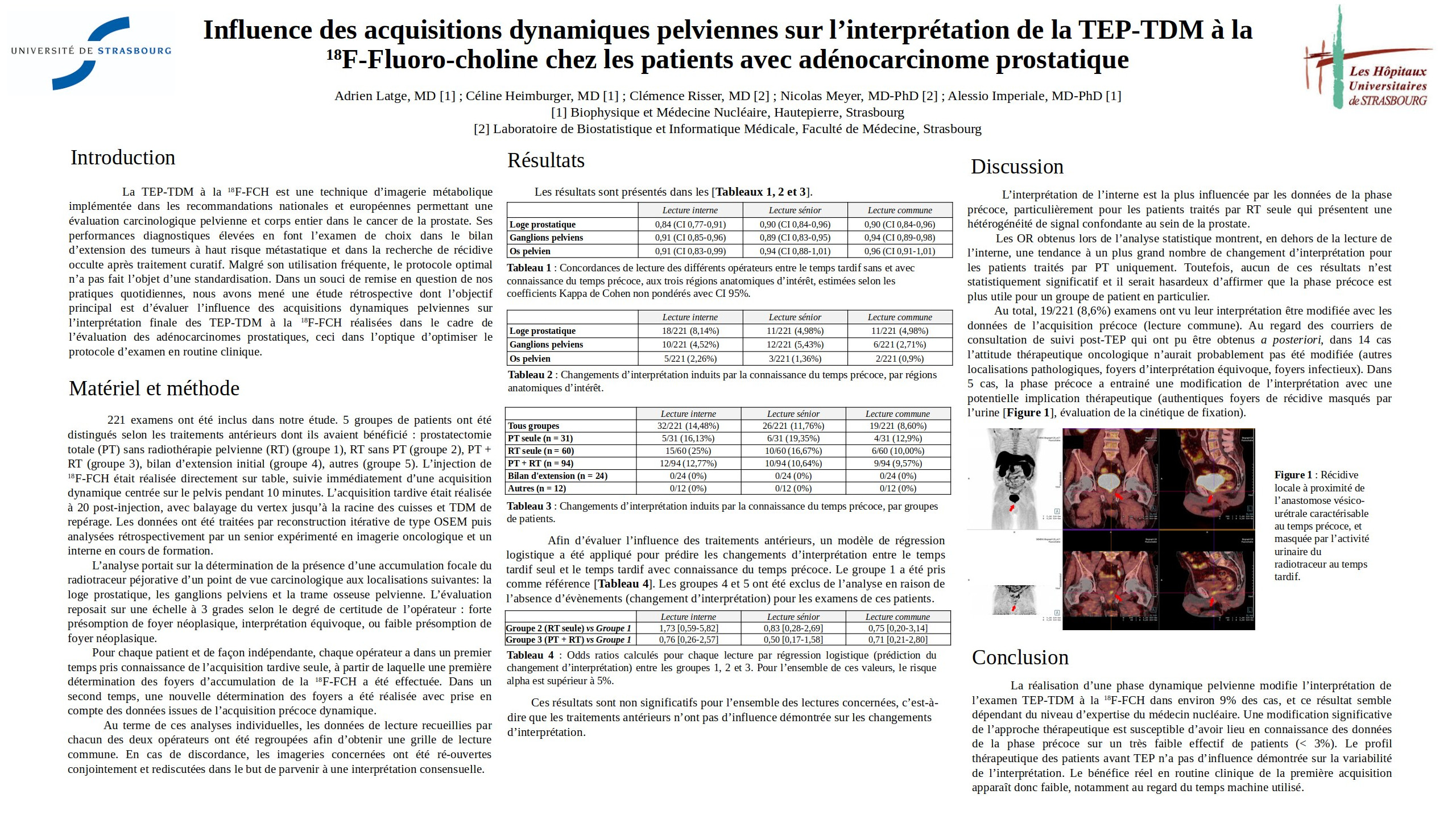 OBJECTIF: Évaluer l’influence des acquisitions dynamiques pelviennes sur l’interprétation finale des TEP-TDM a la 18F-choline réalisés dans le cadre de la réévaluation des adénocarcinomes prostatiques, dans l’optique d’optimiser le protocole d’examen en routine clinique.