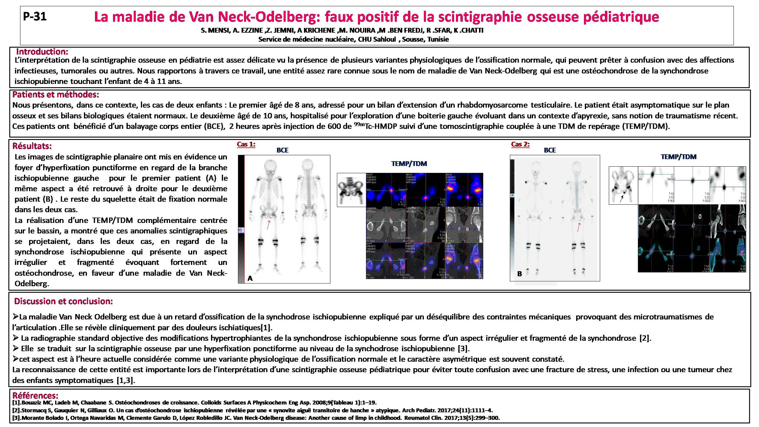 L’ostéochondrose de la synchondrose ischiopubienne est a l’heure actuelle considérée comme une variante physiologique de l’ossification normale et le caractere asymétrique est souvent constaté. La reconnaissance de cette entité est importante lors de l’interprétation d’une scintigraphie osseuse pédiatrique pour éviter toute confusion avec une fracture de stress, une infection ou une tumeur chez des enfants symptomatiques.