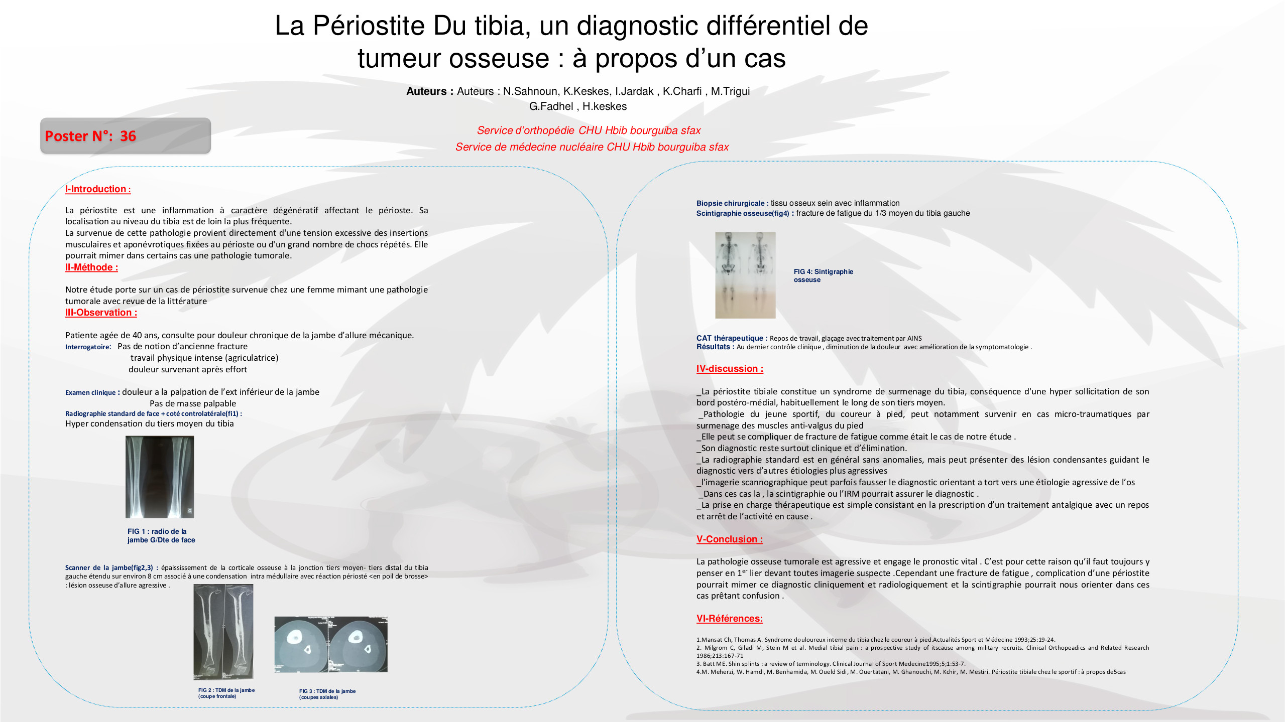 La périostite est une inflammation du périoste souvent décrite chez les sportifs, mais dans notre cas, elle est survenue chez une femme pratiquant un travail physique intense pendant de longues heures. L’Imagerie peut présenter des lésions condensantes avec une réaction périostée guidant le diagnostic vers d’autres étiologies plus agressives. La scintigraphie osseuse est le gold standard pour la confirmation du diagnostic .La prise en charge thérapeutique est simple consistant en la prescription d’un traitement antalgique avec un repos et arret de l’activité en cause.