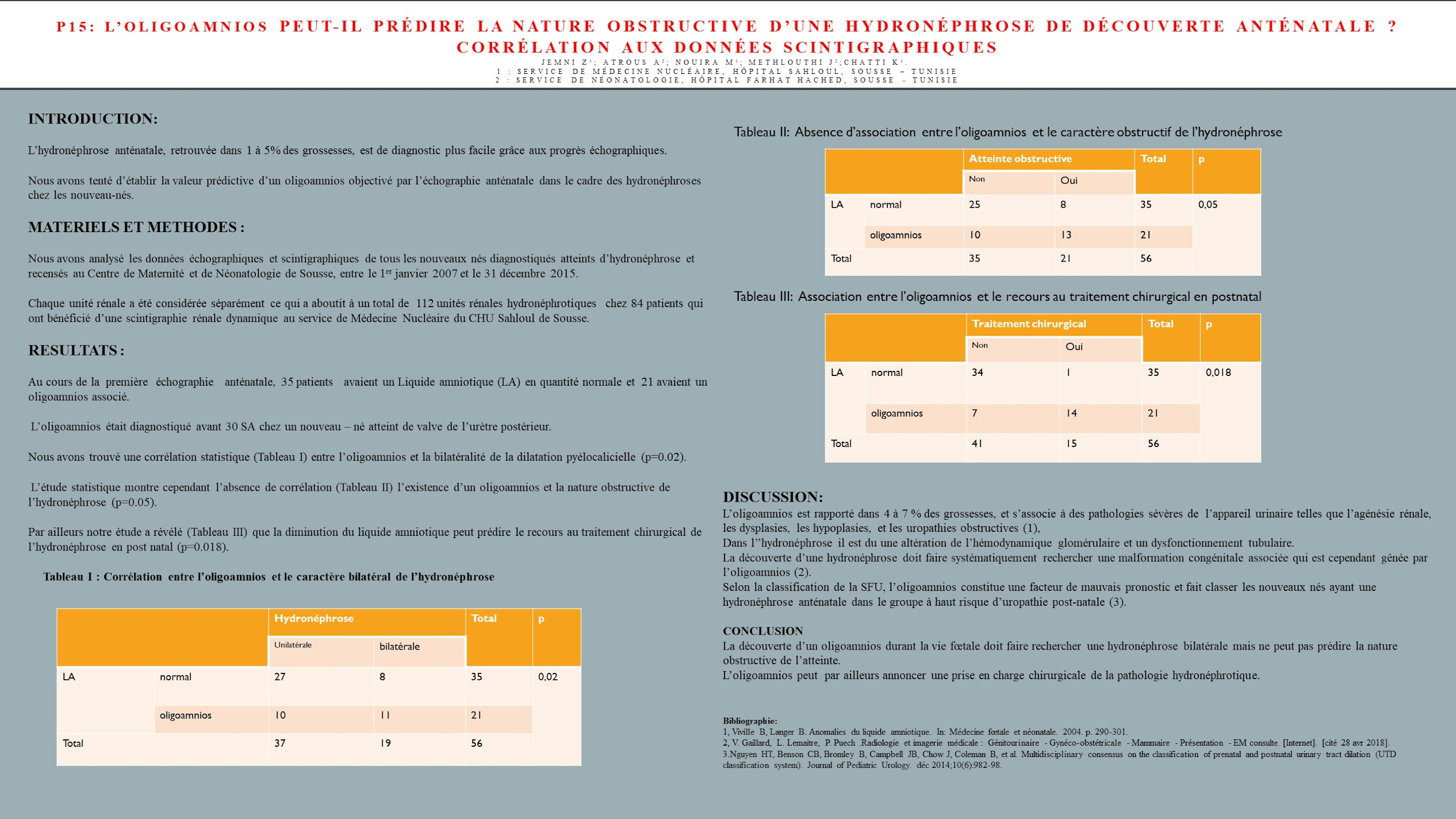 Nous avons trouvé une corrélation statistique entre l’oligoamnios et la bilatéralité de la dilatation pyélocalicielle (p=0.02). L’étude statistique montre cependant l’absence de corrélation entre l’existence d’un oligoamnios et la nature obstructive de l’hydronéphrose (p=0.05). Par ailleurs notre étude a révélé que la diminution du liquide amniotique peut prédire le recours au traitement chirurgical de l’hydronéphrose en post natal (p=0.018).