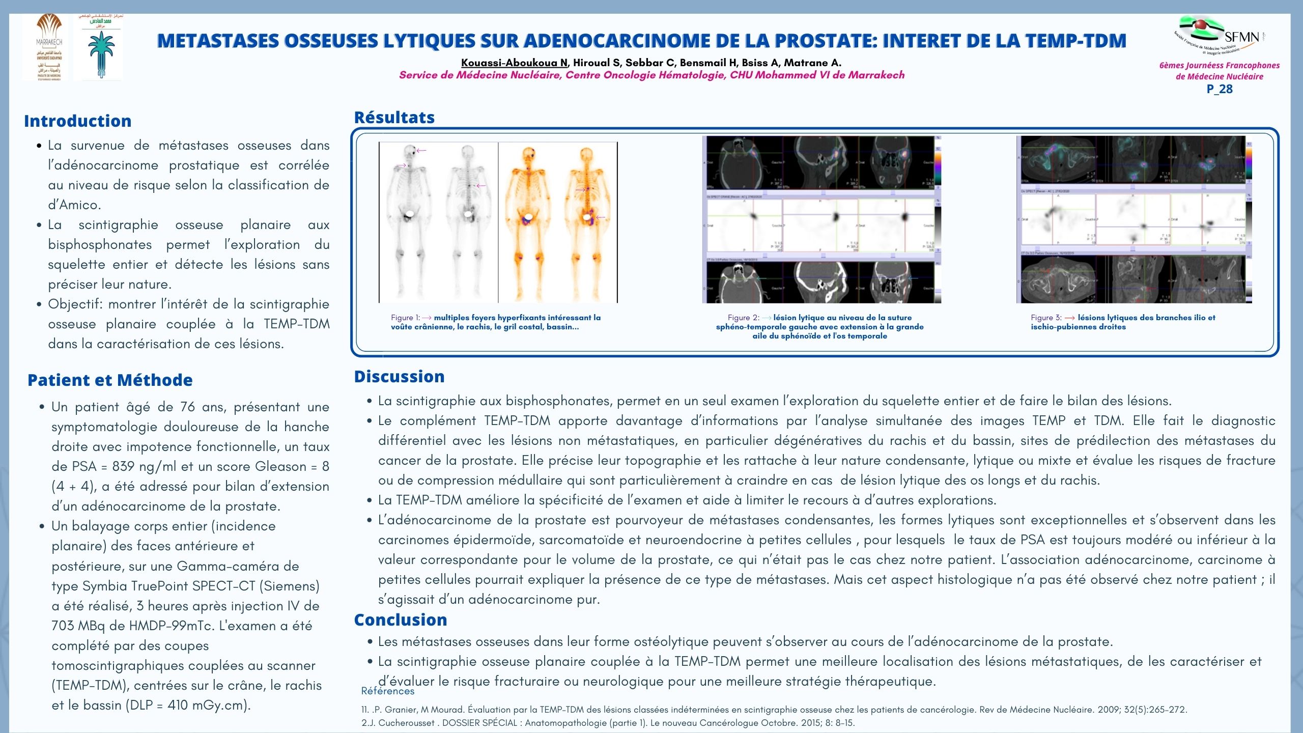 Les métastases ostéolytiques sont tres rares au cours du cancer de la prostate. Il s’agit classiquement de métastases ostéocondensantes observées dans plus de 90% des cas et sont l’apanage de l’adénocarcinome de la prostate. La scintigraphie osseuse planaire couplée a la TEMP/TDM permet de typer ces métastases et leurs risques éventuels. Les formes lytiques s’observent dans les autres carcinomes de la prostate non-adénocarcinome notamment le carcinome épidermoide, le carcinome sarcomatoide et le carcinome neuroendocrine a petites cellules. Dans ces formes le taux de PSA est toujours modéré ou inférieur a la valeur correspondante pour le volume de la prostate. Toutefois, des associations histologiques sont possibles, notamment l’adénocarcinome et le carcinome a petites cellules du fait de leur disposition topographique similaire et expliqueraient la présence de ce type de métastases. Mais cet aspect histologique n’a pas été observé chez notre patient ; il s’agissait d’un adénocarcinome pur.