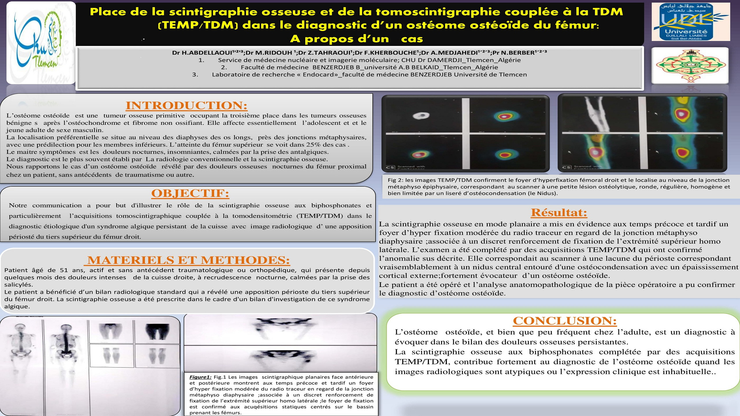 La scintigraphie osseuse en mode planaire a mis en évidence aux temps précoce et tardif un foyer d’hyper fixation modérée du radio traceur en regard de la jonction métaphyso diaphysaire ;associée a un discret renforcement de fixation de l’extrémité supérieur homo latérale . L’examen a été complété par des acquisitions TEMP/TDM qui ont confirmé l’anomalie sus décrite. Elle correspondait au scanner a une lacune du périoste correspondant vraisemblablement a un nidus central entouré d’une ostéocondensation avec un épaississement cortical externe;fortement évocateur d’un ostéome ostéoide. Le patient a été opéré et l’analyse anatomopathologique de la piece opératoire a pu confirmer le diagnostic d’ostéome ostéoide.