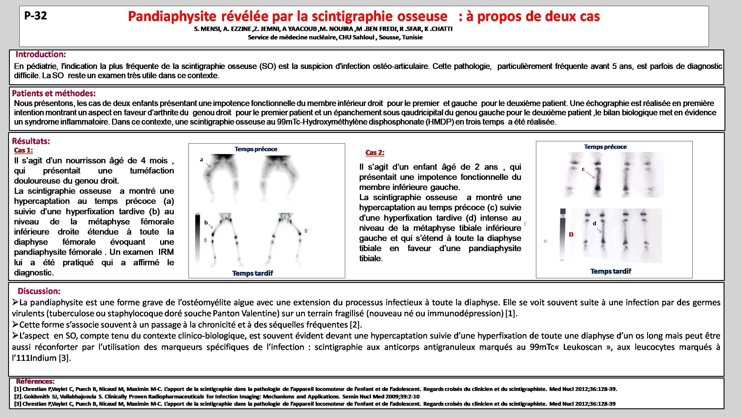 L’examen scintigraphie a mis en évidence une hyperfixation au temps précoce et tardif au niveau de la métaphyse tibiale inférieure gauche étendue a toute la diaphyse chez le premier patient et une hyperfixation oblongue au niveau de la diaphyse fémorale droite pour le deuxieme patient. Cet aspect scintigraphique est évocateur d’une pandiaphysite. Les deux patients ont bénéficié d’un examen IRM qui a confirmé le diagnostic.