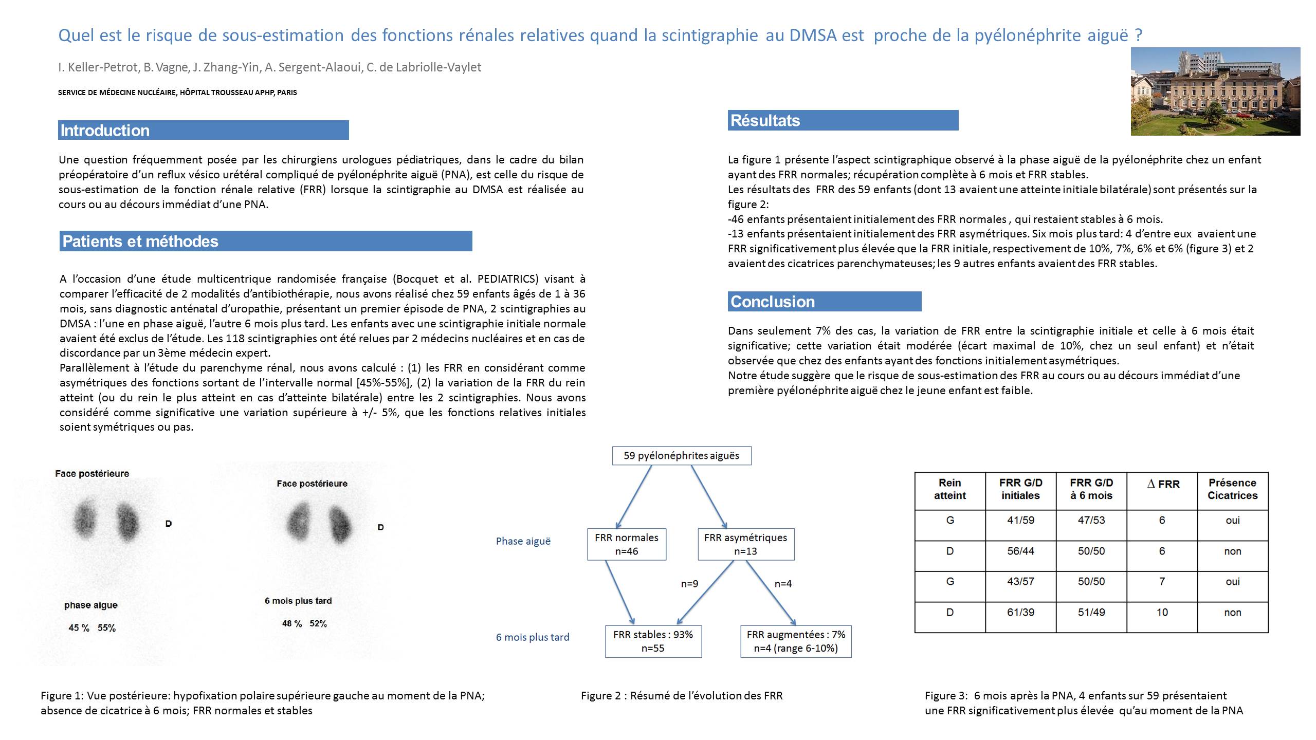 PATIENTS et METHODES : A l’occasion d’une étude multicentrique randomisée française (Bocquet et al. PEDIATRICS) visant a comparer l’efficacité de 2 modalités d’antibiothérapie, nous avons réalisé chez 59 enfants âgés de 1 a 36 mois, sans diagnostic anténatal d’uropathie, présentant un premier épisode de PNA, 2 scintigraphies au DMSA : l’une en phase aiguë, l’autre 6 mois plus tard. Les enfants avec une scintigraphie initiale normale avaient été exclus de l’étude. Les 118 scintigraphies ont été relues par 2 médecins nucléaires et en cas de discordance par un 3eme médecin expert.