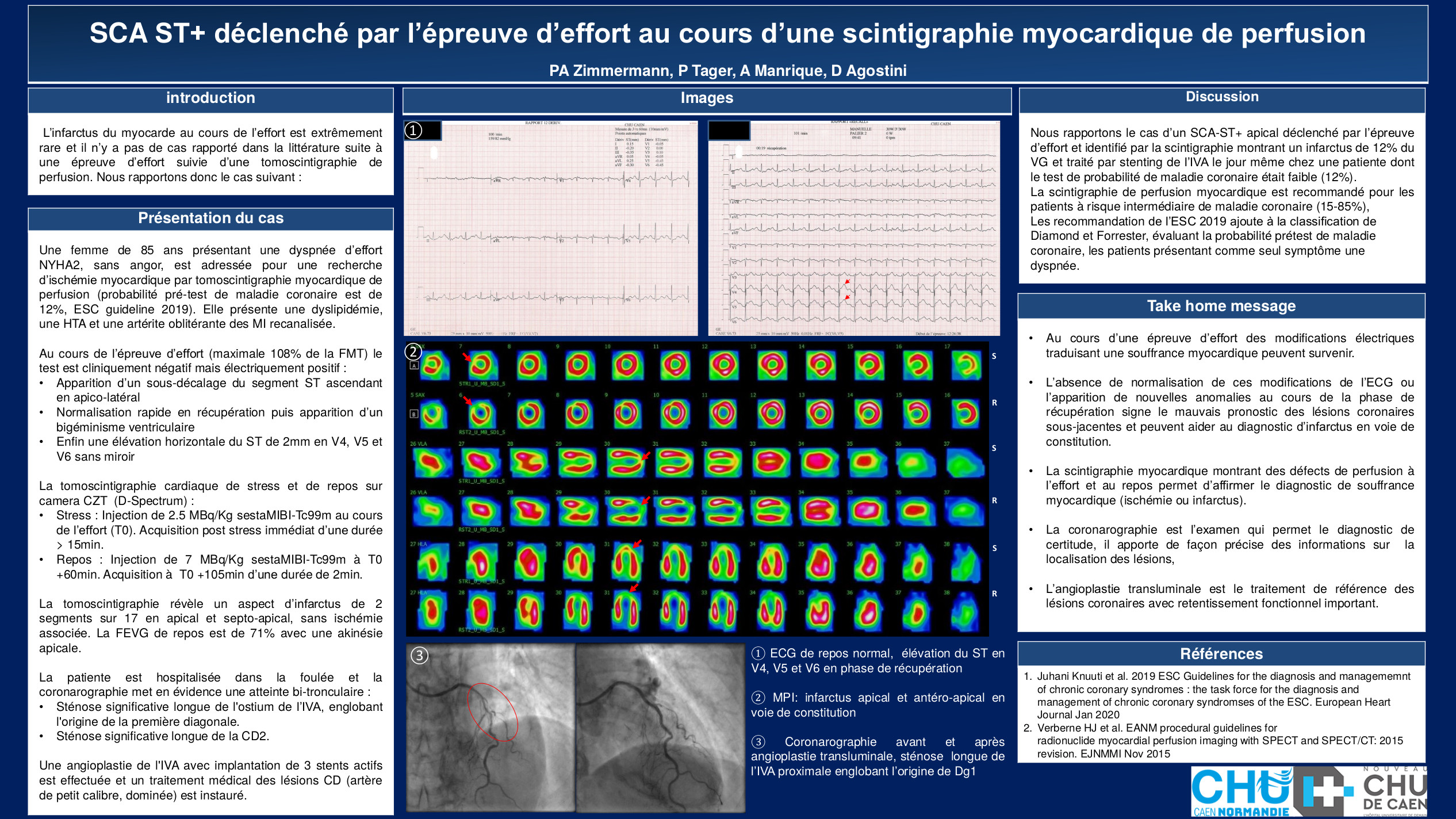 En conclusion, nous rapportons le cas d’un SCA-ST+ apical déclenché par l’épreuve d’effort et identifié par la scintigraphie montrant un infarctus de 12% du VG et traité par stenting de l’IVA le jour meme chez une patiente dont le test de probabilité de maladie coronaire était faible.