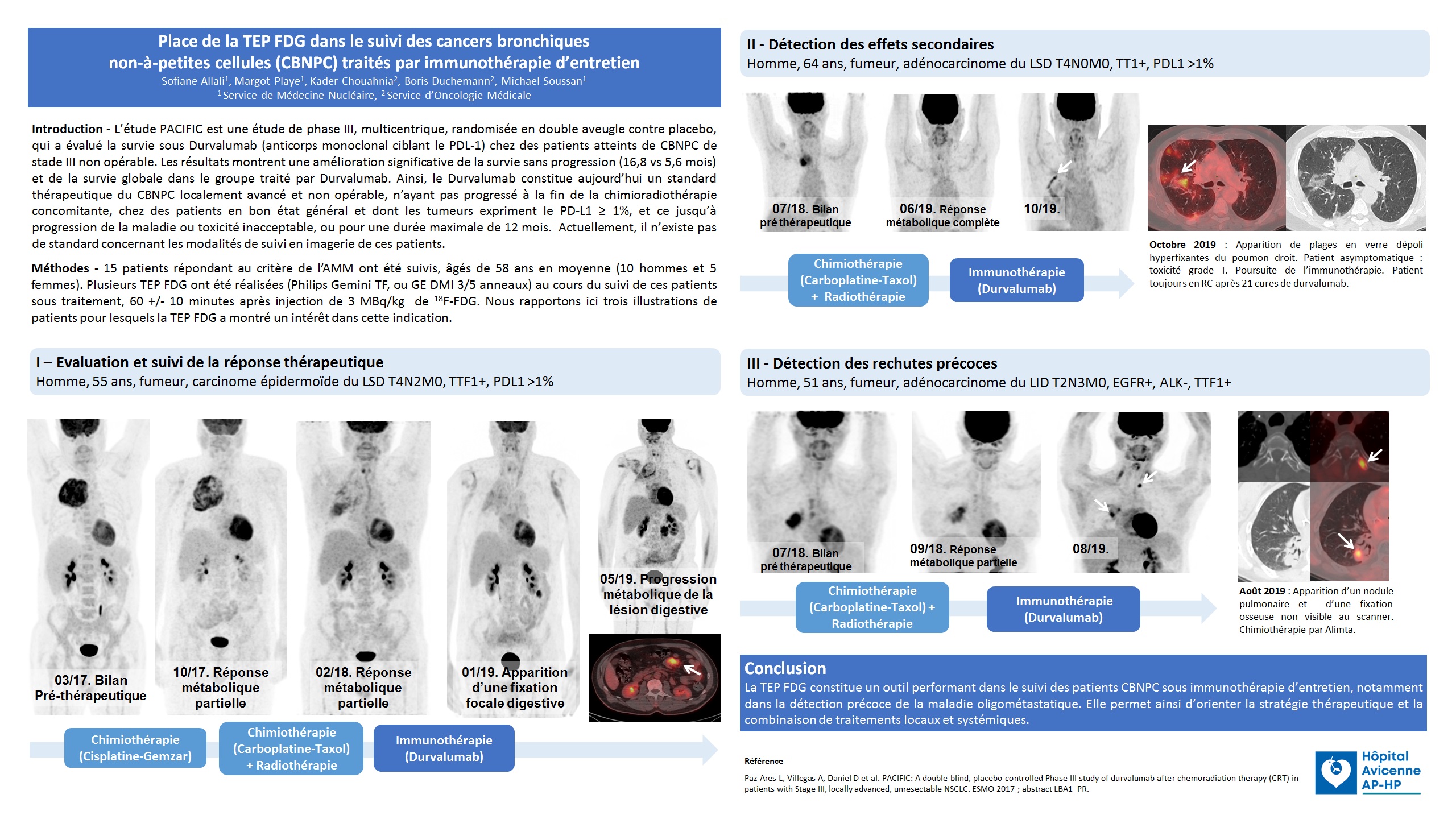 Le durvalumab, anticorps monoclonal anti-PDL1, a obtenu l’AMM fin 2018 pour le traitement du cancer bronchique non a petites cellules localement avancé et non opérable n’ayant pas progressé a la fin de la radiochimiothérapie concomitante a base de platine (sous réserve d’un état général préservé et d’une expression tumorale de PD-L1 >= 1%). A ce jour, la place de la TEP/TDM au 18F-FDG dans l’évaluation de ces traitements n’est pas définie. Nous illustrons notre expérience au sein du service de médecine nucléaire de l’hôpital universitaire Avicenne a travers le suivi en TEP de 15 patients traités par durvalumab. La TEP a montré son utilité dans ce contexte en permettant d’identifier les profils évolutifs sous traitement et les toxicités, permettant une personnalisation de la prise en charge des patients.