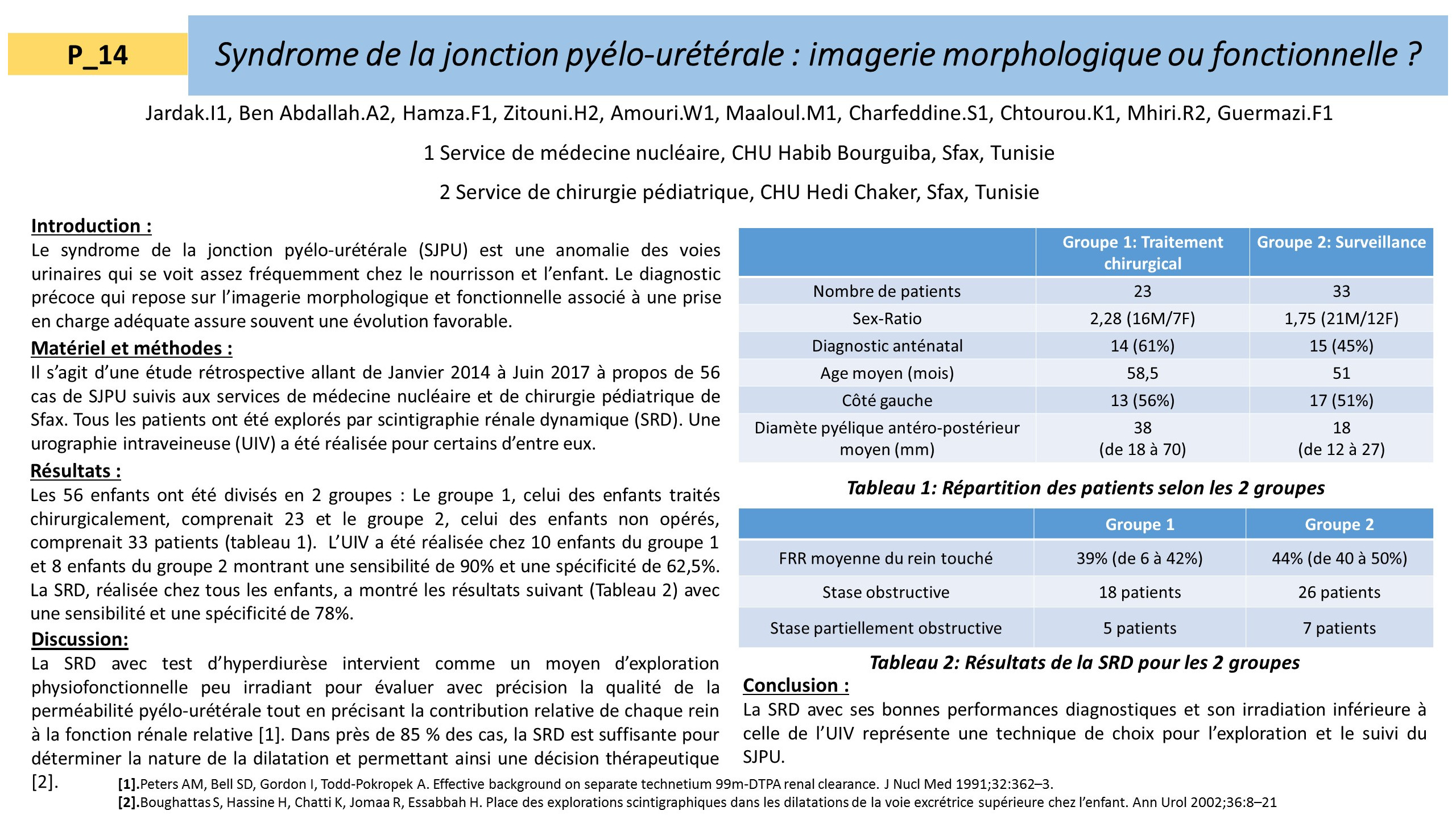 Il s’agit d’une étude rétrospective allant de Janvier 2014 a Juin 2017 a propos de 56 cas de SJPU suivis aux services de médecine nucléaire et de chirurgie pédiatrique de Sfax. Tous les patients ont été explorés par scintigraphie rénale dynamique. Une urographie intraveineuse (UIV) a été réalisée pour certains d’entre eux.